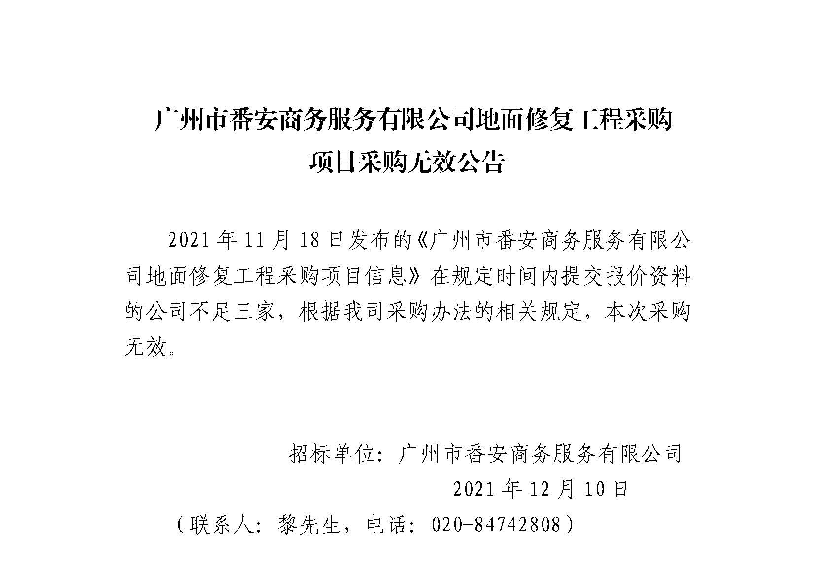 广州市番安商务服务有限公司地面修复工程采购项目采购无效公告