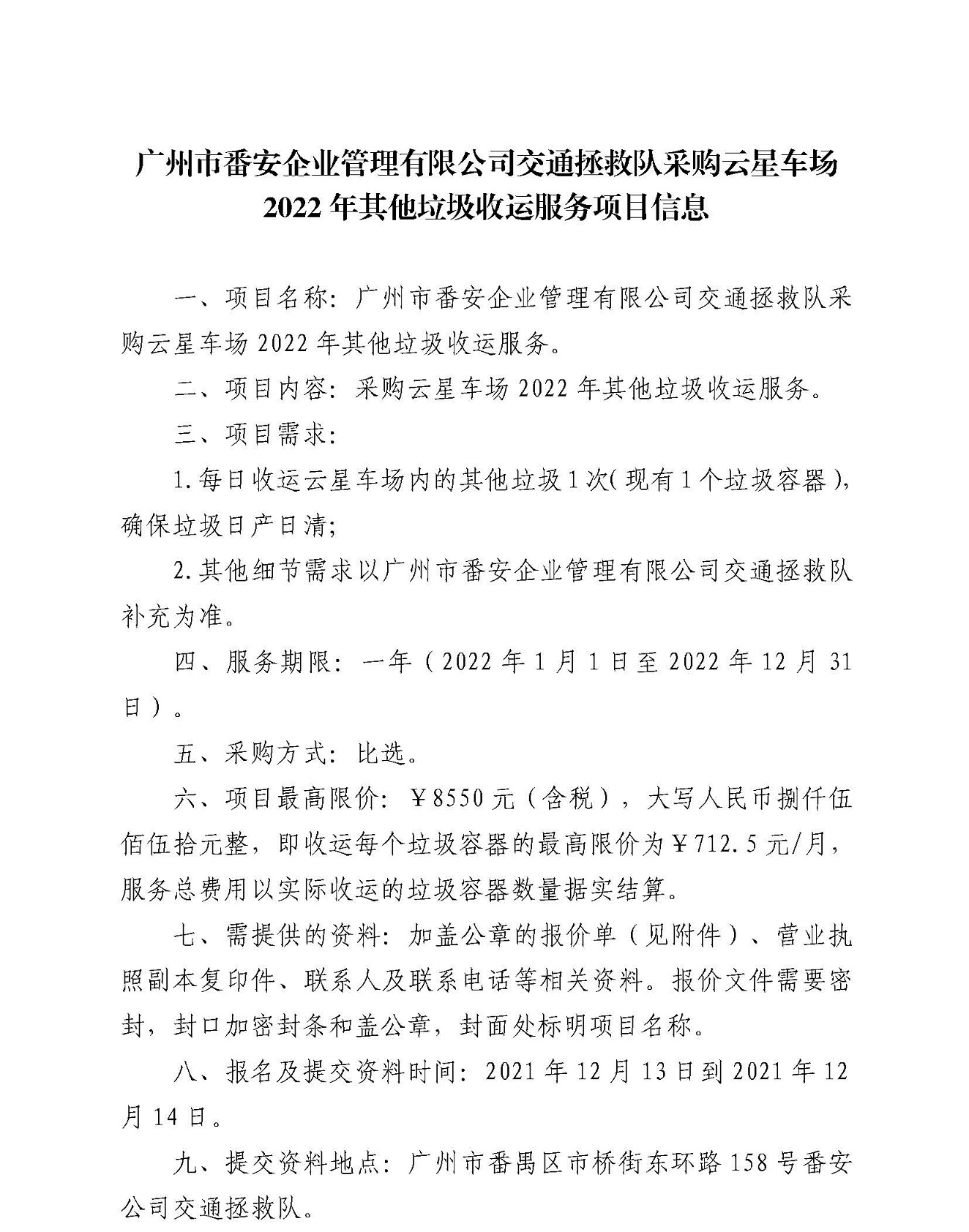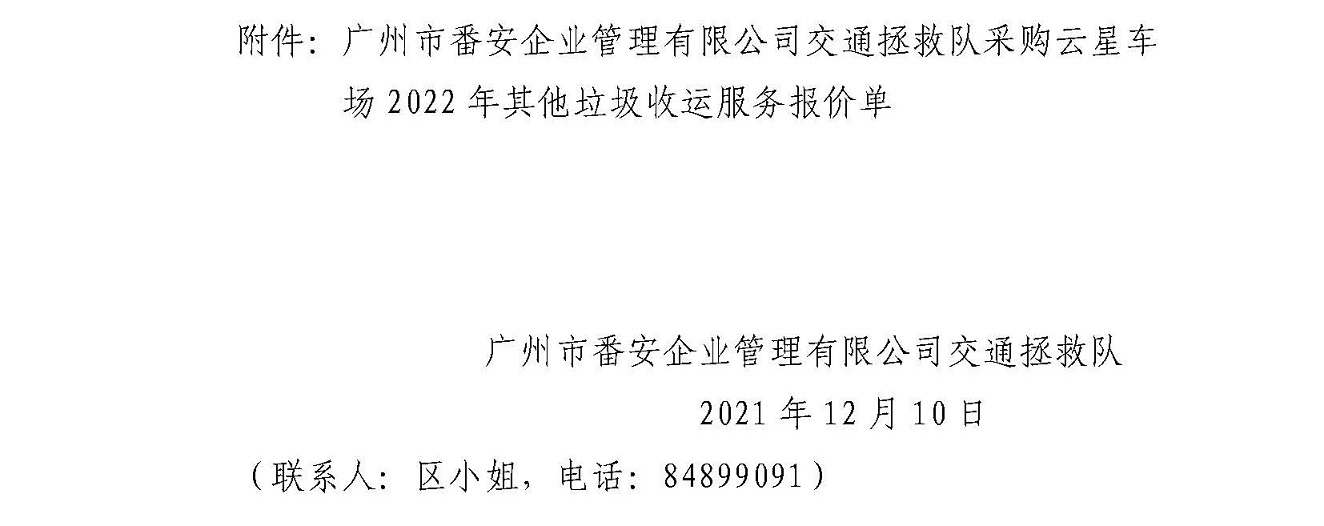 广州市番安企业管理有限公司交通拯救队采购云星车场2022年其他垃圾收运服务项目信息