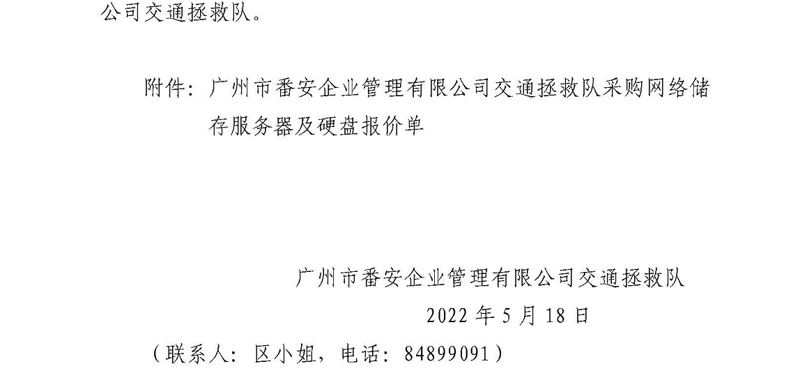 广州市番安企业管理有限公司交通拯救队采购网络储存服务器及硬盘项目信息