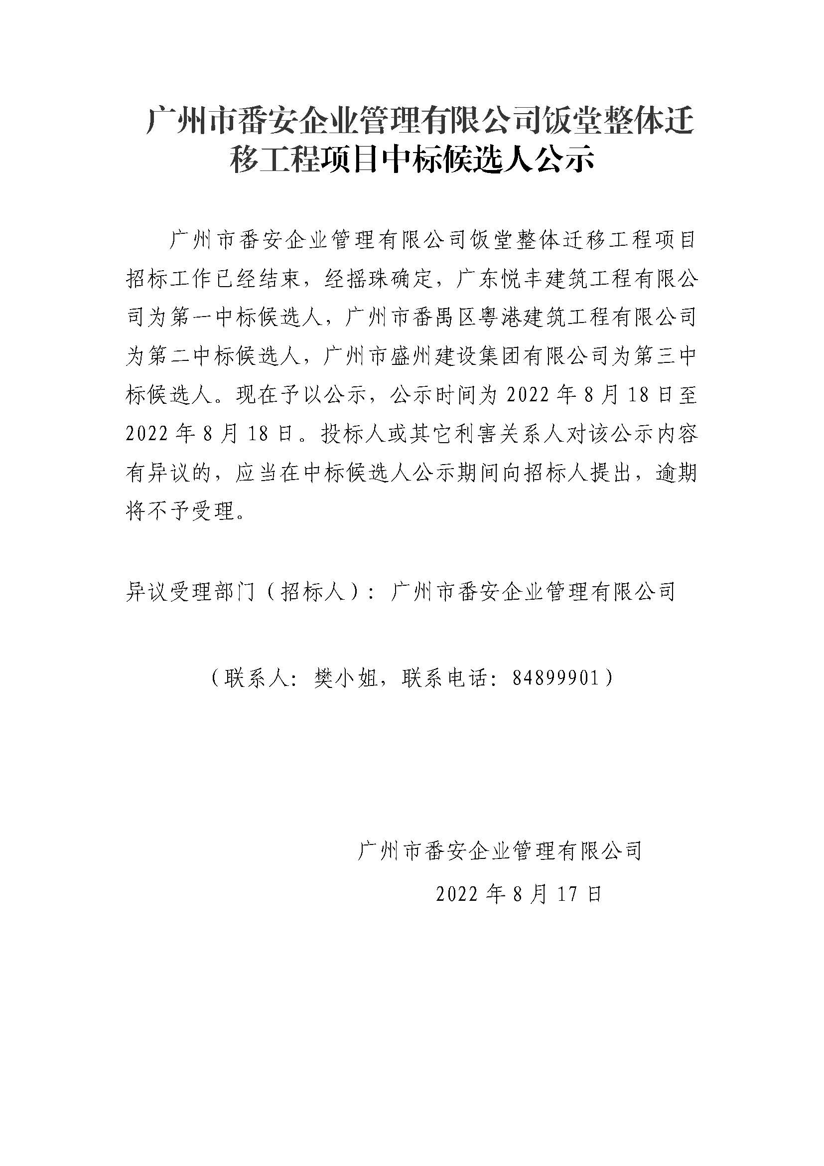 广州市番安企业管理有限公司饭堂整体迁移工程项目中标候选人公示