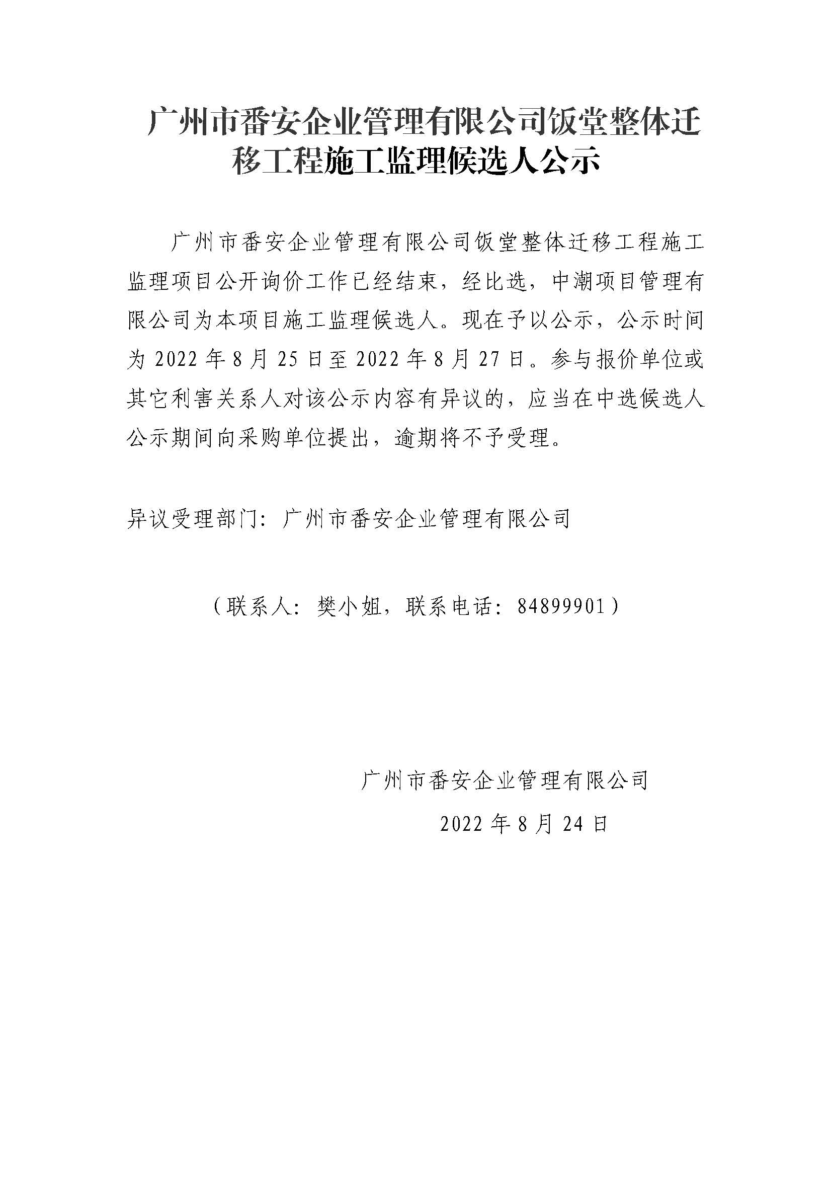 广州市番安企业管理有限公司饭堂整体迁移工程施工监理候选人公示