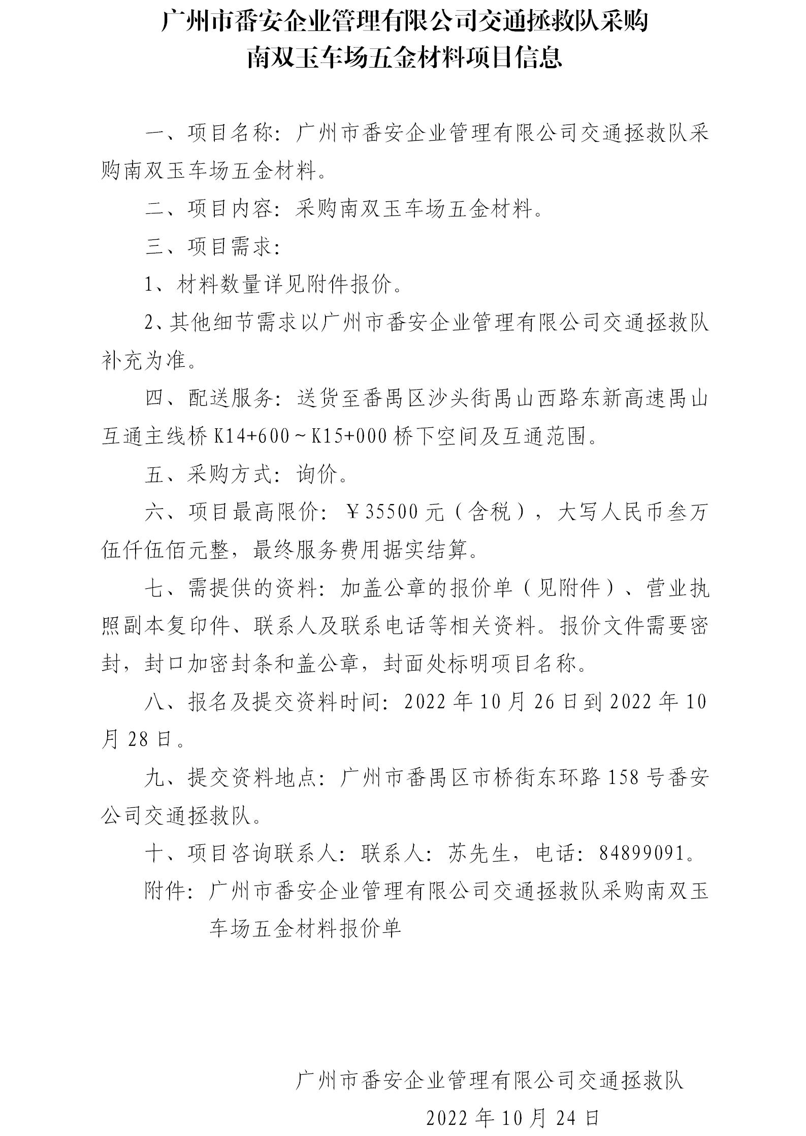 广州市番安企业管理有限公司交通拯救队采购南双玉车场五金材料项目信息