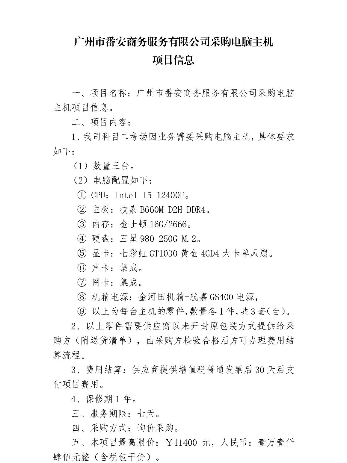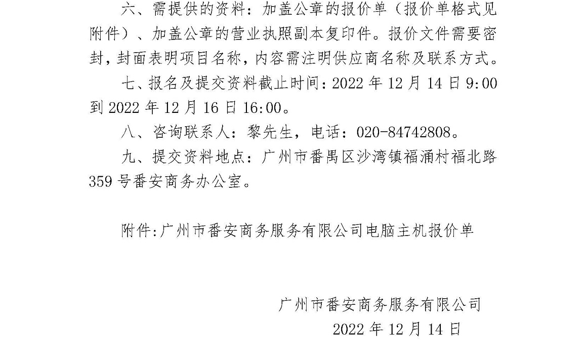 广州市番安商务服务有限公司采购电脑主机项目信息