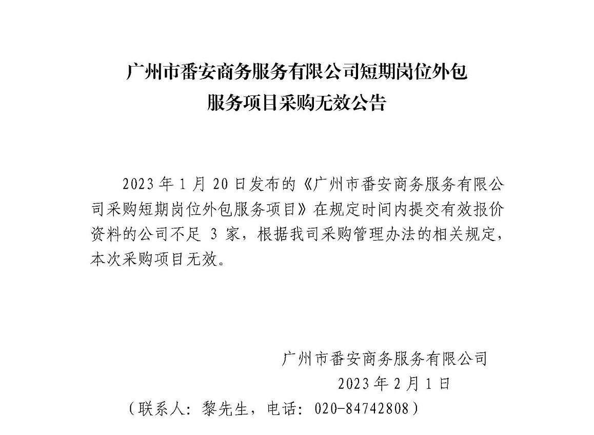 广州市番安商务服务有限公司短期岗位外包服务项目采购无效公告