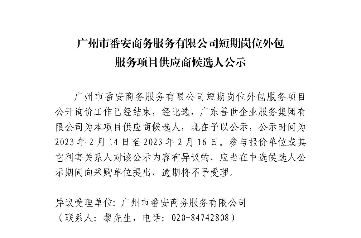 广州市番安商务服务有限公司短期岗位外包服务项目供应商候选人公示