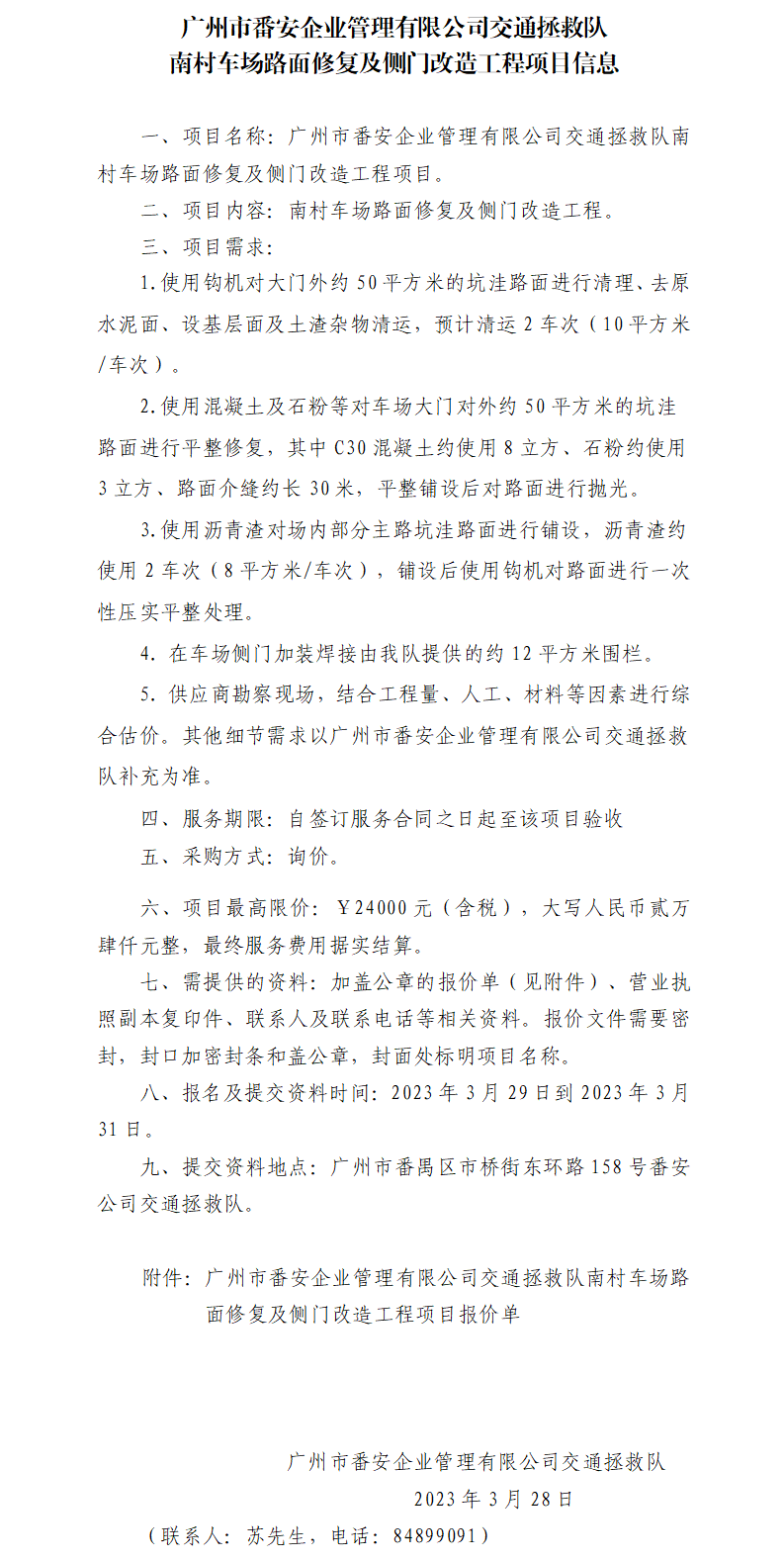 附件:广州市番安企业管理有限公司交通拯救队南村车场路面修复及侧门改造工程报价单.xls