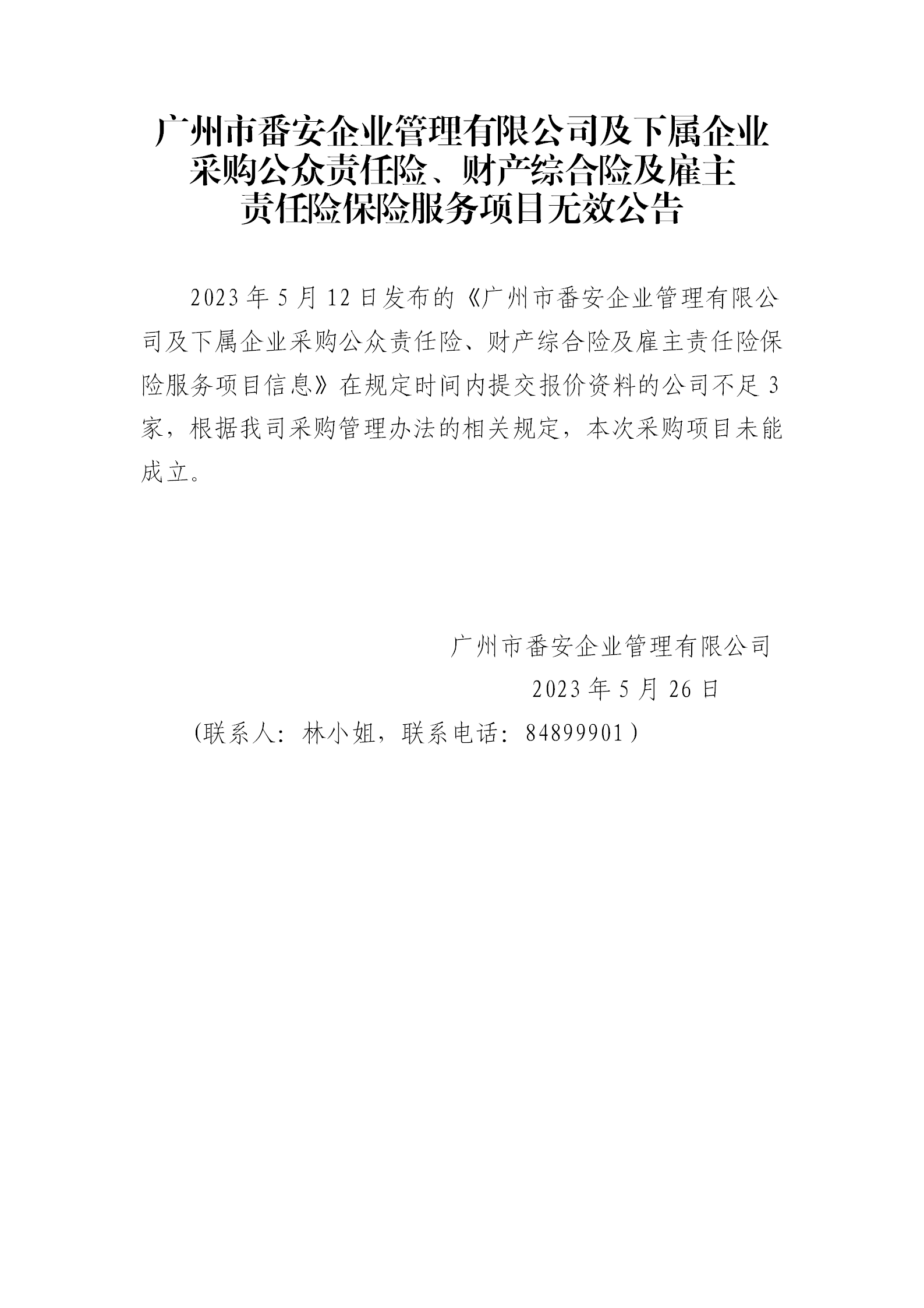 广州市番安企业管理有限公司及下属企业公众责任险、财产综合险及雇主责任险保险服务项目采购无效公告