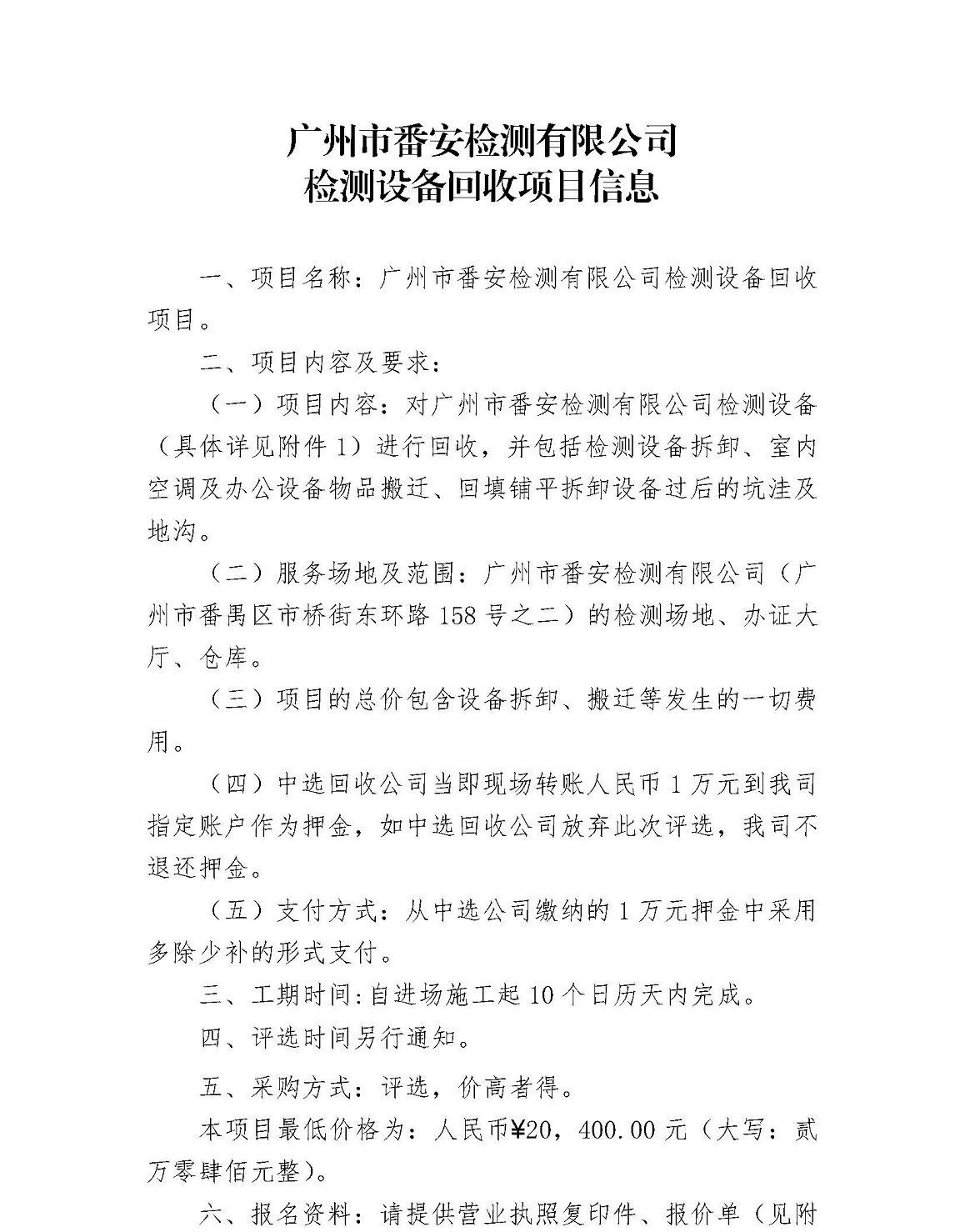 广州市番安检测有限公司检测设备回收项目信息(重新发布)