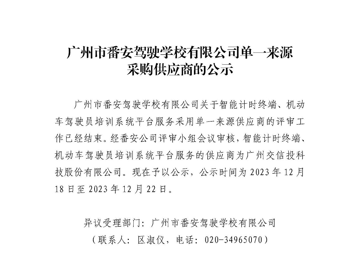 广州市番安驾驶学校有限公司单一来源采购供应商的公示