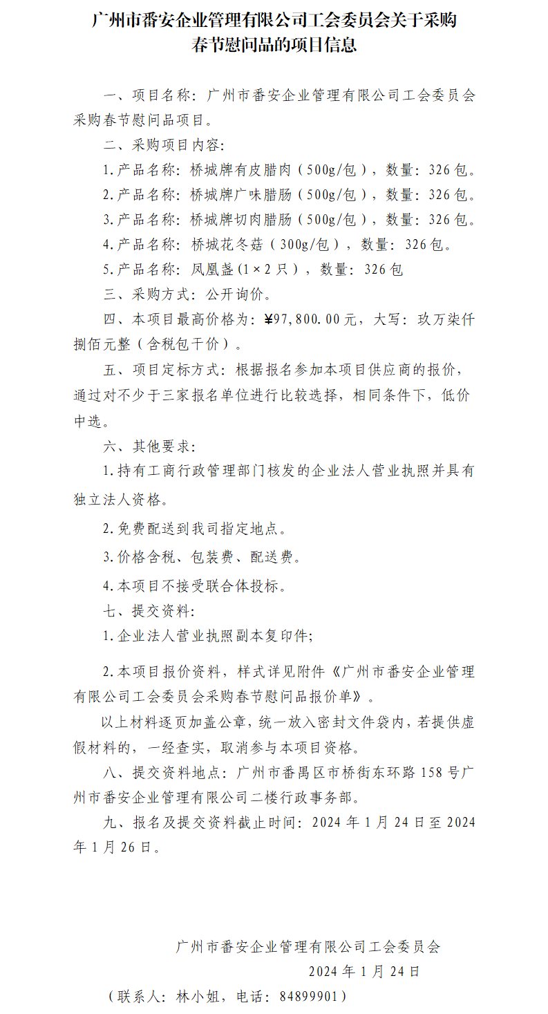 广州市番安企业管理有限公司工会委员会关于采购春节慰问品的项目信息