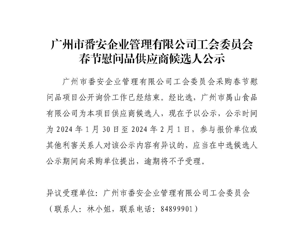 广州市番安企业管理有限公司工会委员会春节慰问品供应商候选人公示