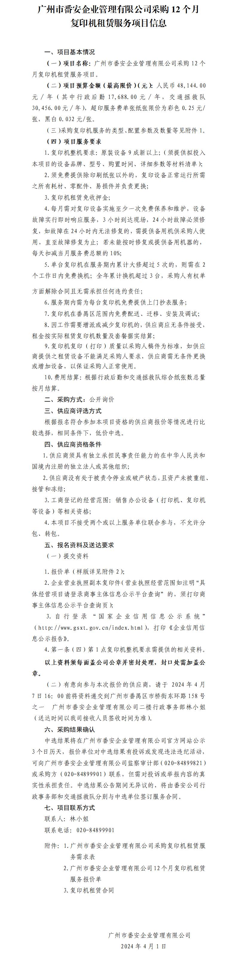 附件1:广州市番安企业管理有限公司采购复印机租赁服务需求表.doc