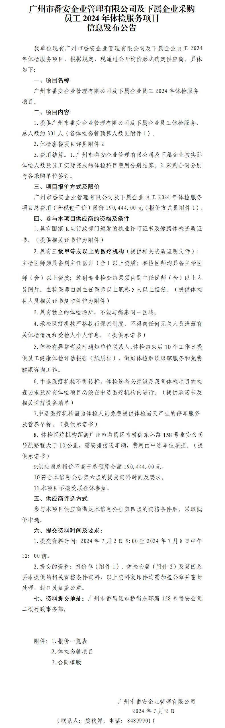 广州市番安企业管理有限公司及下属企业采购员工2024年体检服务项目信息发布公告