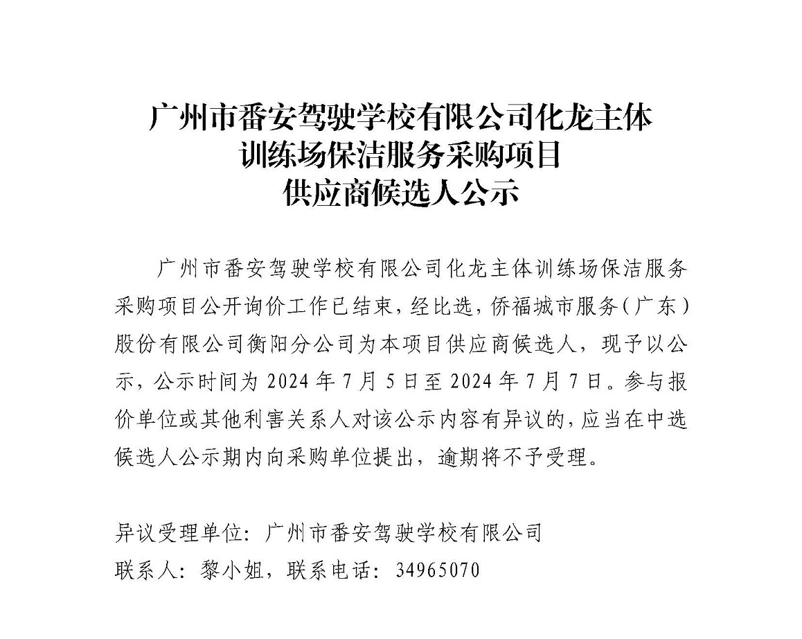 广州市番安驾驶学校有限公司化龙主体训练场保洁服务采购项目供应商候选人公示