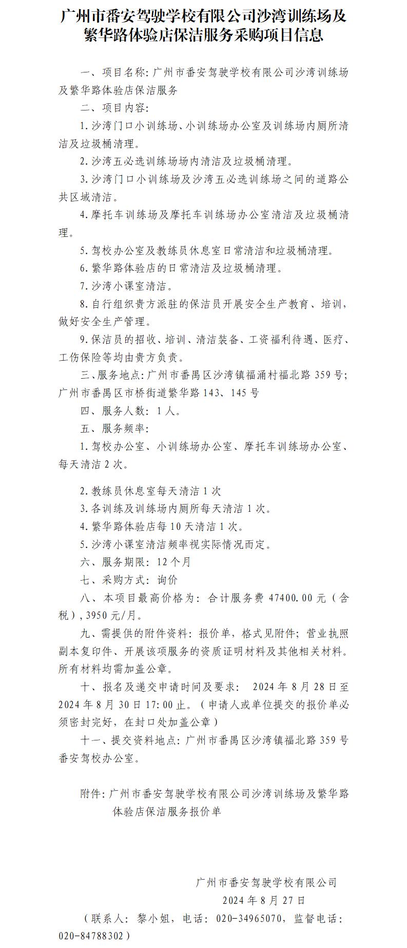 广州市番安驾驶学校有限公司沙湾训练场及繁华路体验店保洁服务采购项目信息
