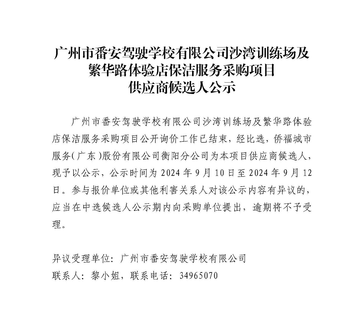 广州市番安驾驶学校有限公司沙湾训练场及繁华路体验店保洁服务采购项目供应商候选人公示