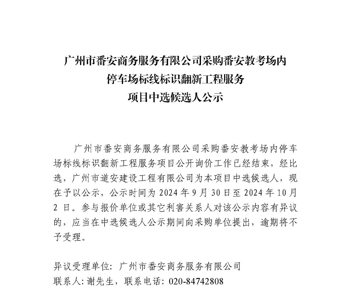 广州市番安商务服务有限公司采购番安教考场内停车场标线标识翻新工程服务项目中选候选人公示