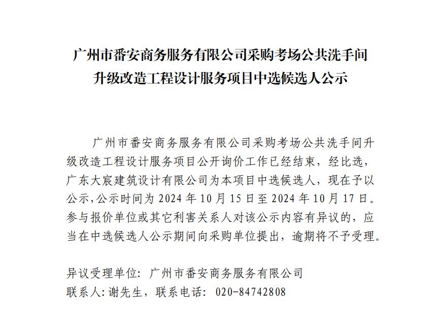 广州市番安商务服务有限公司采购考场公共洗手间 升级改造工程设计服务项目中选候选人公示