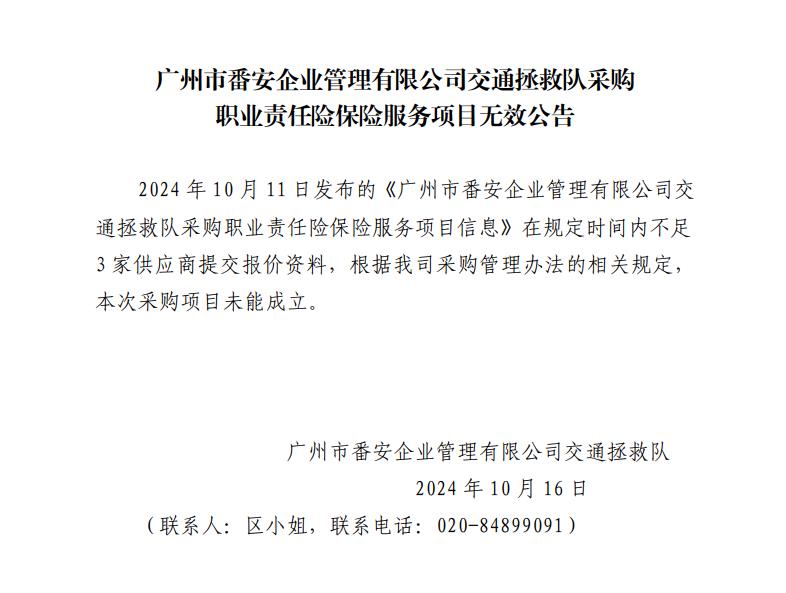 广州市番安企业管理有限公司交通拯救队采购职业责任险保险服务项目无效公告
