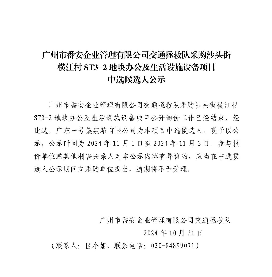 广州市番安企业管理有限公司交通拯救队采购沙头街横江村ST3-2地块办公及生活设施设备项目中选候选人公示
