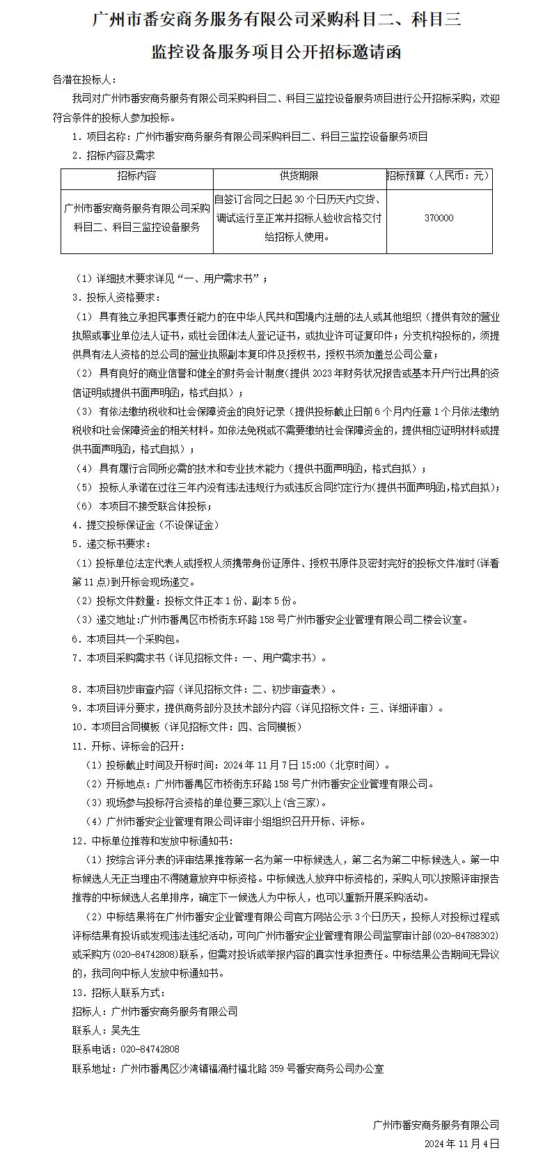广州市番安商务服务有限公司采购科目二、科目三监控设备服务项目公开招标邀请函