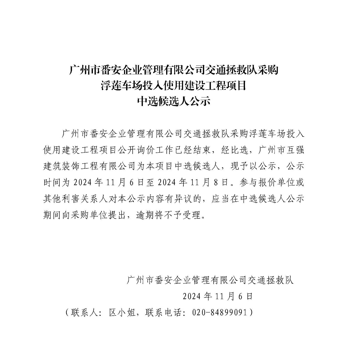 广州市番安企业管理有限公司交通拯救队采购浮莲车场投入使用建设工程项目中选候选人公示