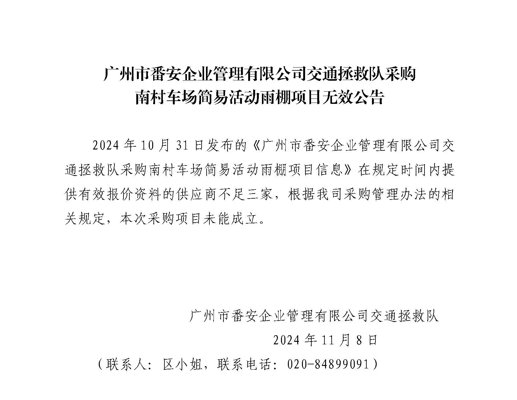 广州市番安企业管理有限公司交通拯救队采购南村车场简易活动雨棚项目无效公告