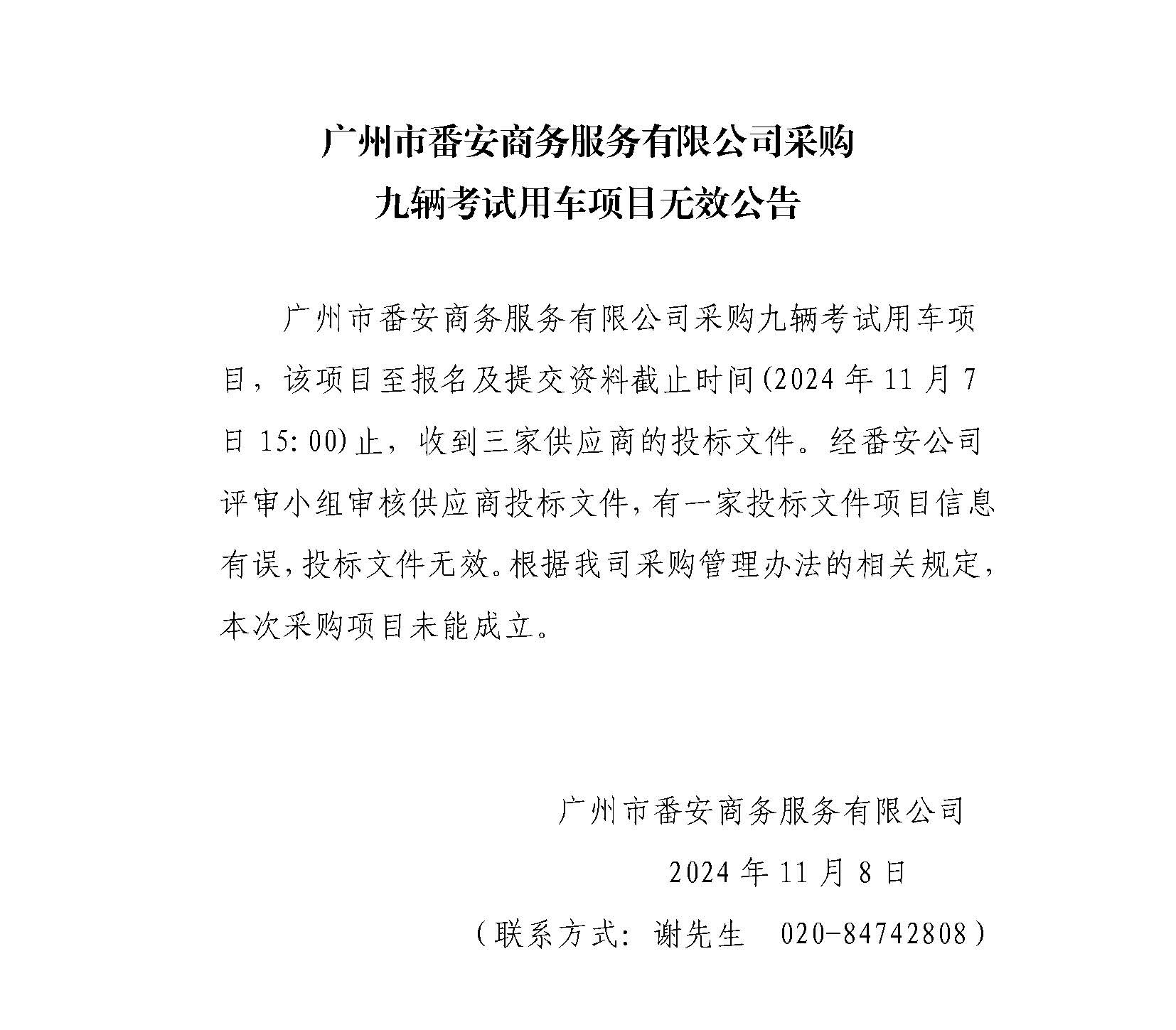 广州市番安商务服务有限公司采购九辆考试用车项目无效公告