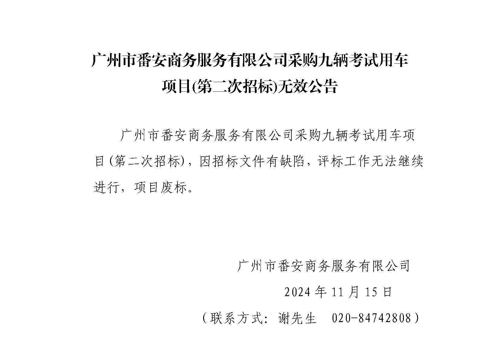 广州市番安商务服务有限公司采购九辆考试用车项目(第二次招标)无效公告