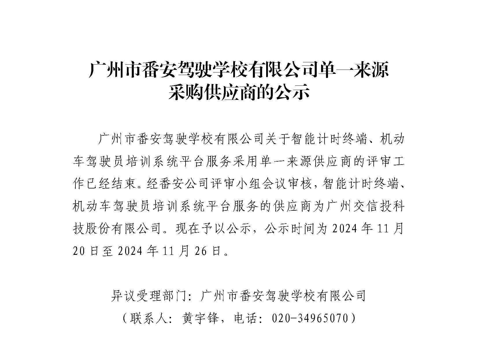 广州市番安驾驶学校有限公司单一来源采购供应商的公示