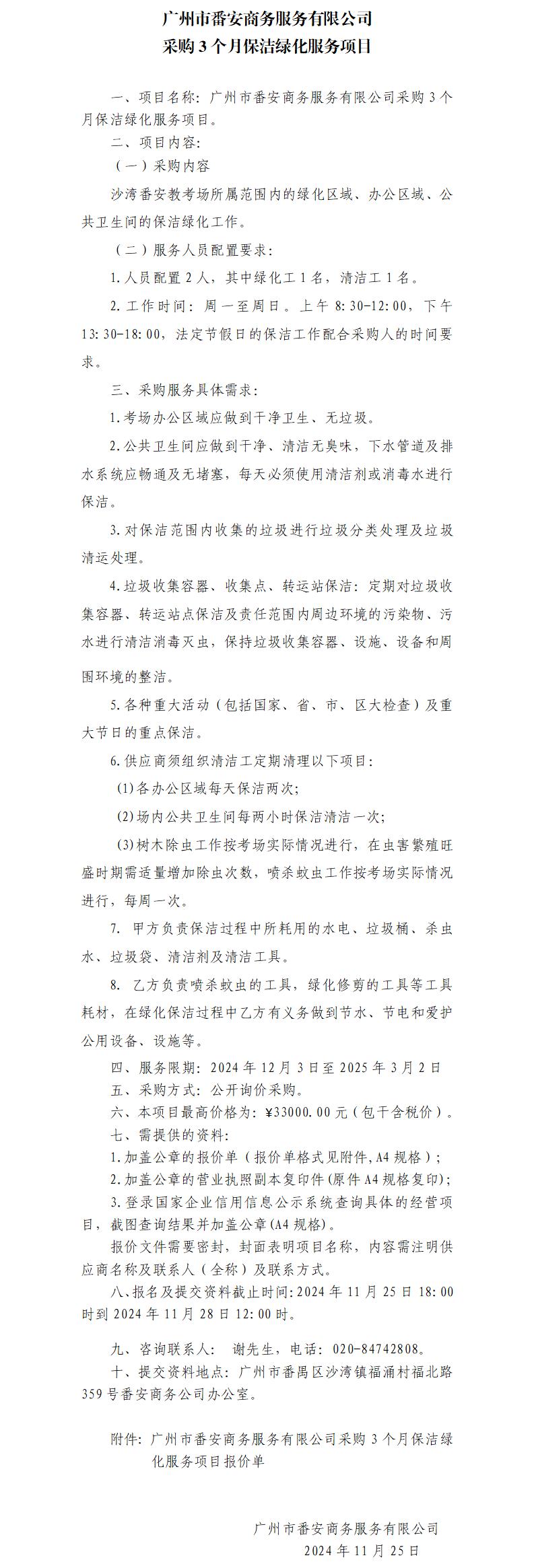 广州市番安商务服务有限公司采购3个月保洁绿化服务项目信息