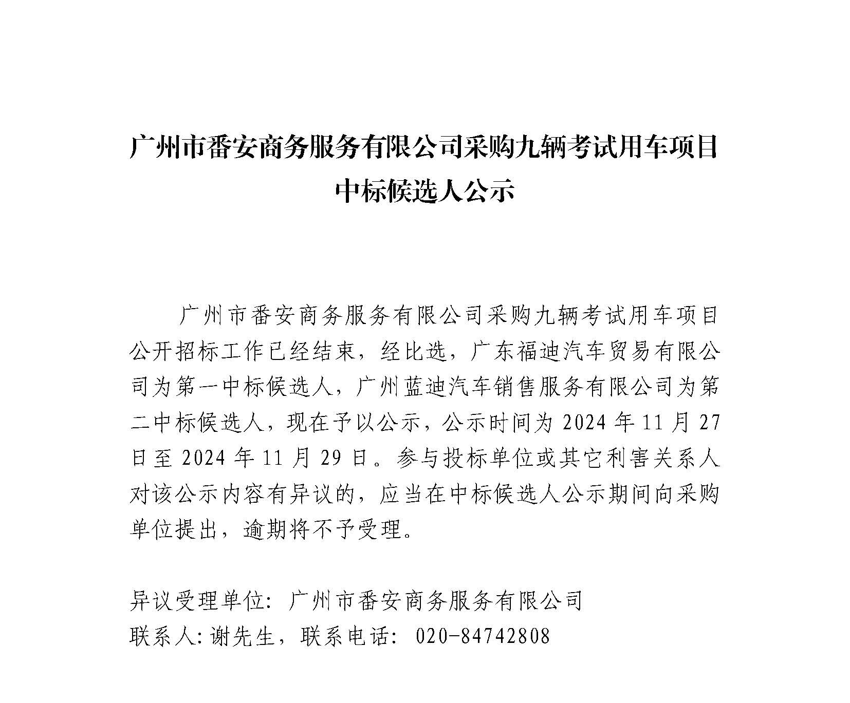 广州市番安商务服务有限公司采购两辆考试用车项目中选候选人公示