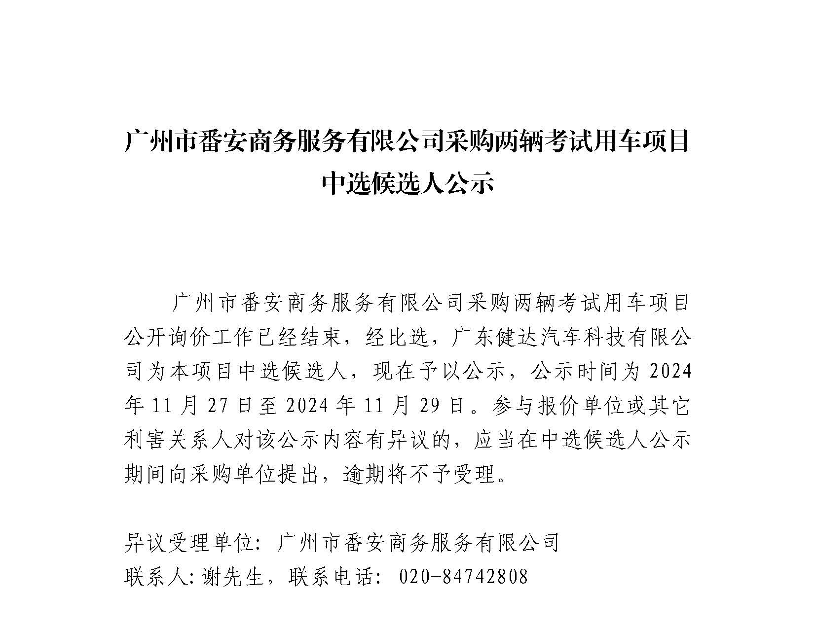 广州市番安商务服务有限公司采购两辆考试用车项目中选候选人公示