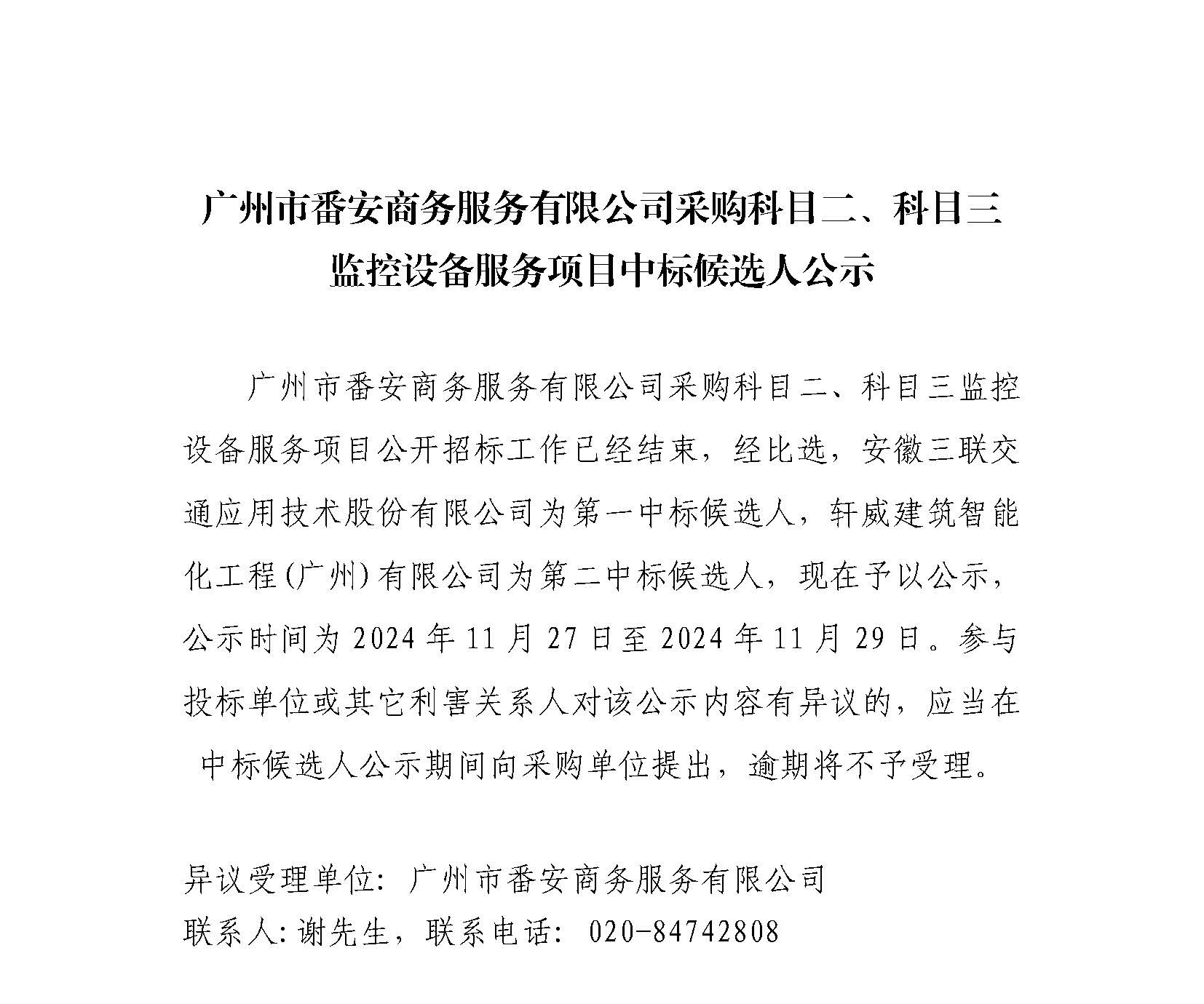 广州市番安商务服务有限公司采购科目二、科目三监控设备服务项目中标候选人公示