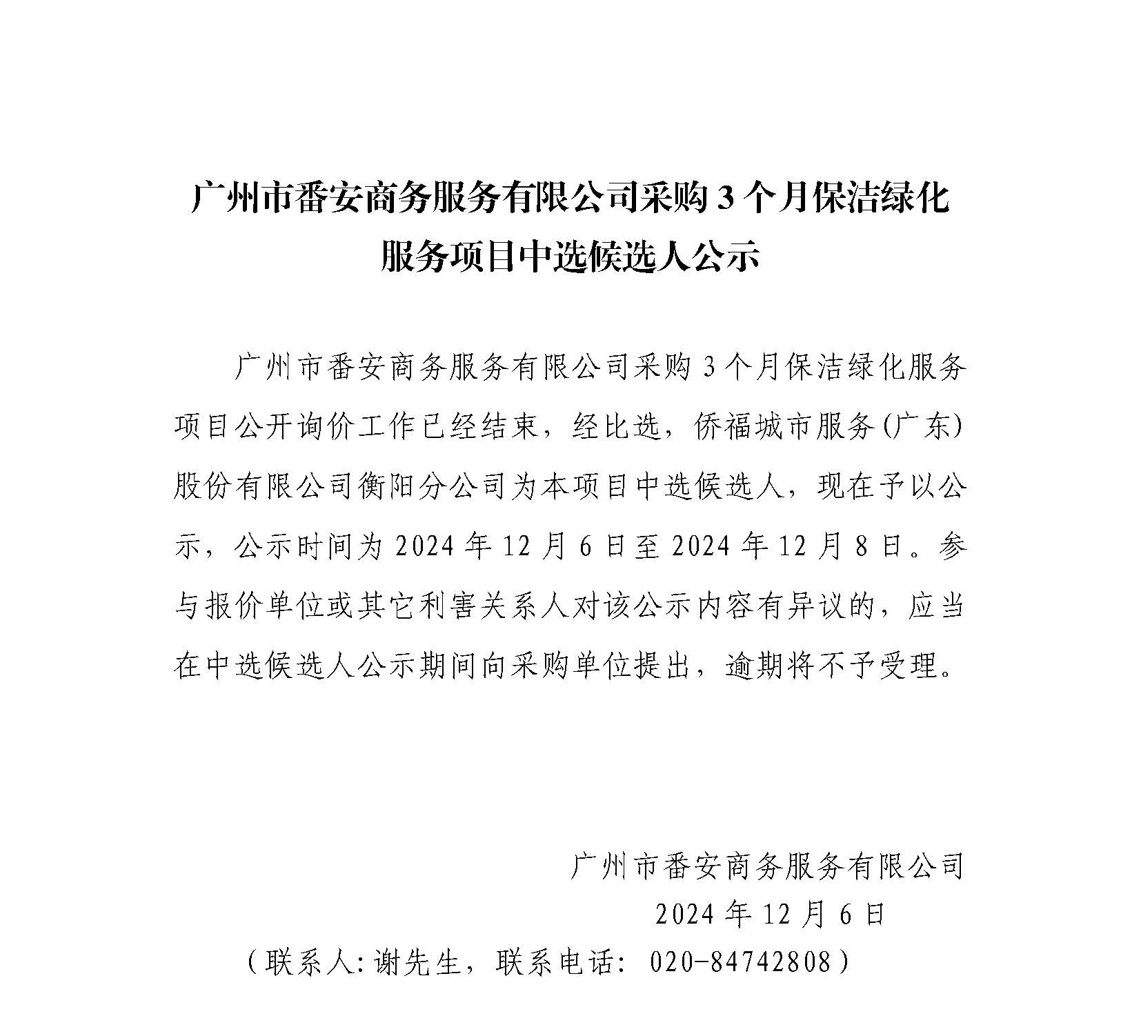 广州市番安商务服务有限公司采购3个月保洁绿化服务项目中标候选人公示