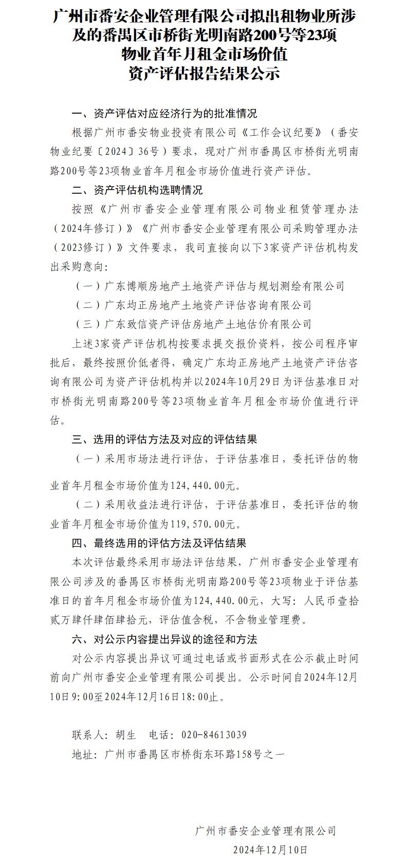 广州市番安企业管理有限公司拟出租物业所涉及的番禺区市桥街光明南路200号等23项物业首年月租金市场价值的资产评估报告结果公示