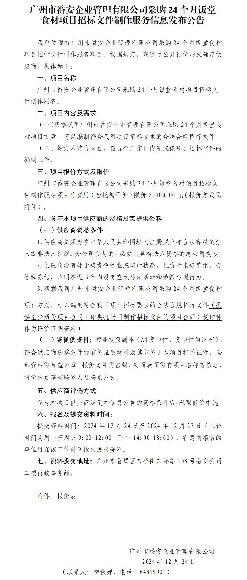 广州市番安企业管理有限公司采购24个月饭堂食材项目招标文件制作服务信息发布公告