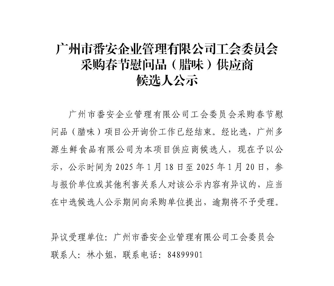 广州市番安企业管理有限公司工会委员会采购春节慰问品(腊味)供应商候选人公示