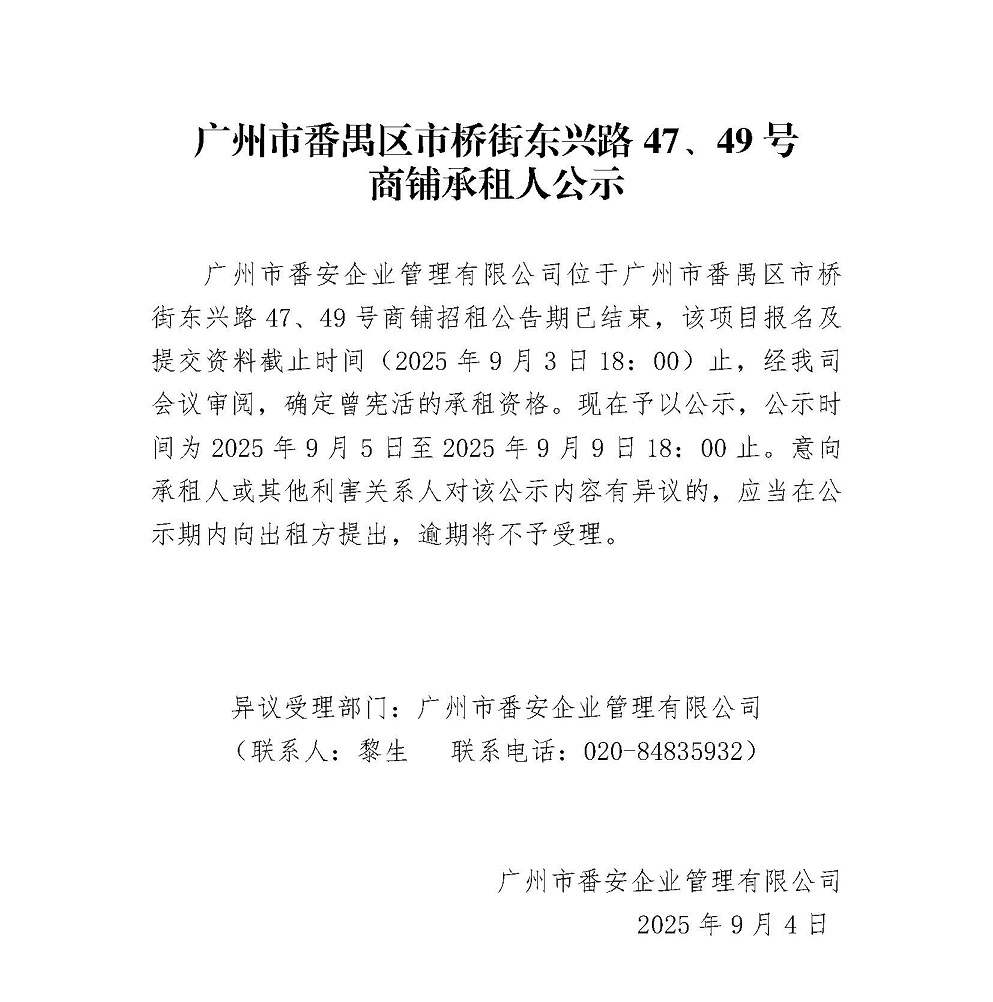 广州市番禺区市桥东兴路47、49号商铺承租人公示