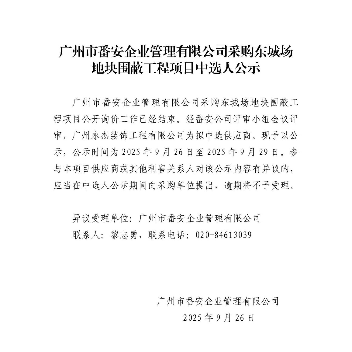 广州市番安企业管理有限公司采购东城场地块围蔽工程项目中选人公示