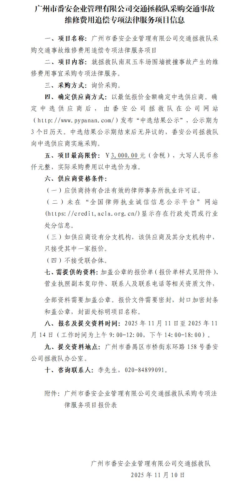 附件:广州市番安企业管理有限公司交通拯救队采购交通事故维修费用追偿专项法律服务项目报价表.doc