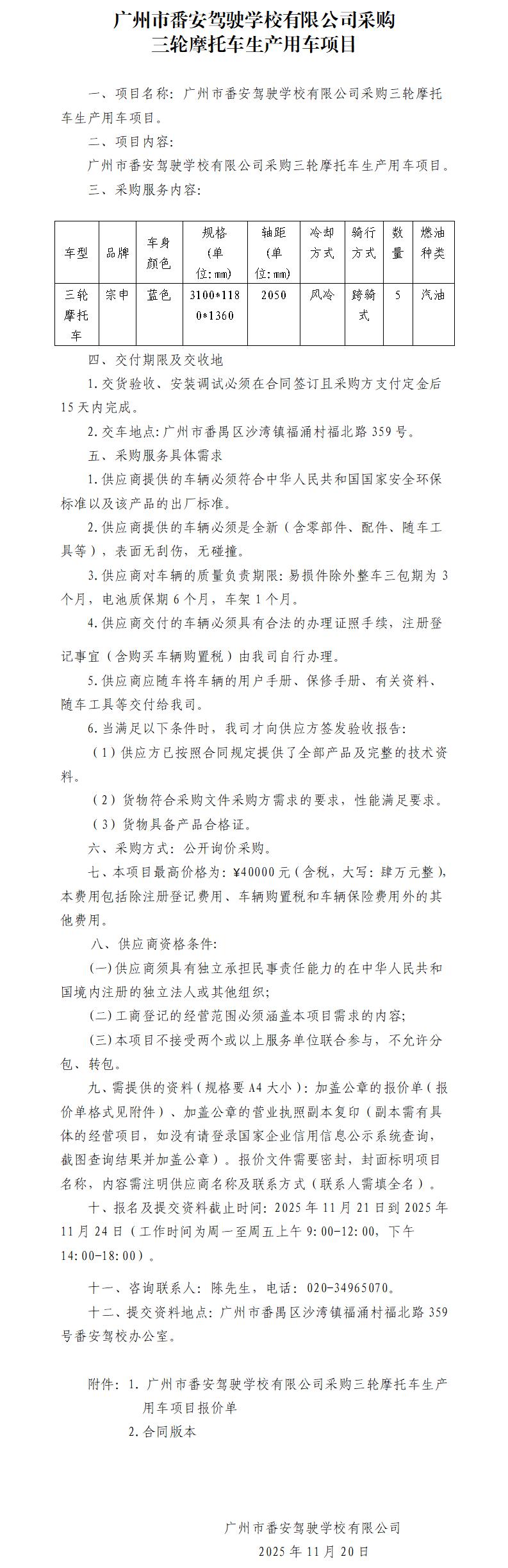 广州市番安驾驶学校有限公司采购三轮摩托车生产用车项目报价单.xls