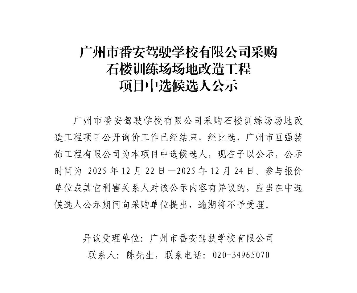 广州市番安驾驶学校有限公司采购石楼训练场场地改造工程项目中选候选人公示